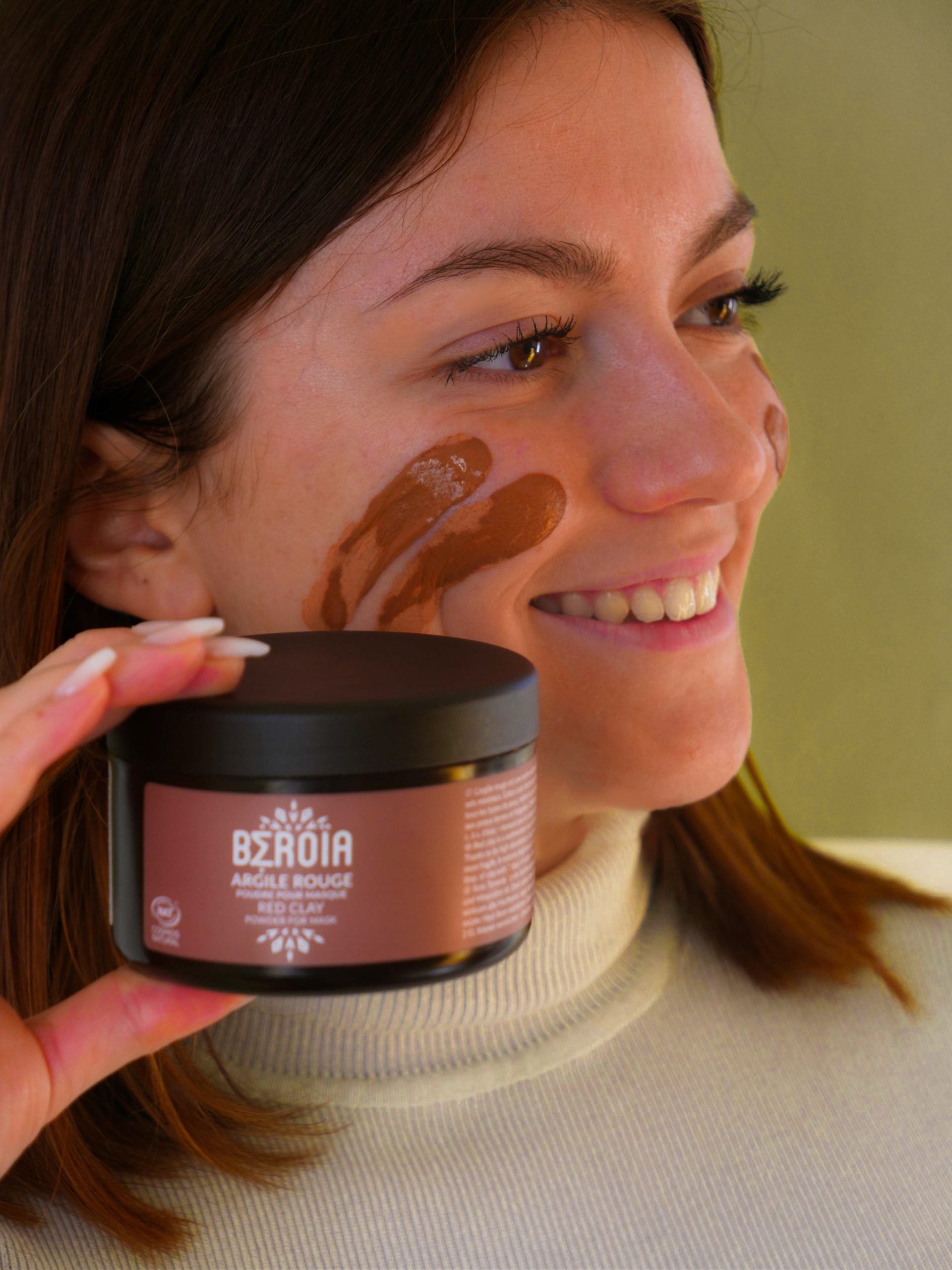- L’argile rouge est utilisée depuis des siècles dans les régions méditerranéennes et orientales pour ses vertus minérales et sa capacité à illuminer le teint.