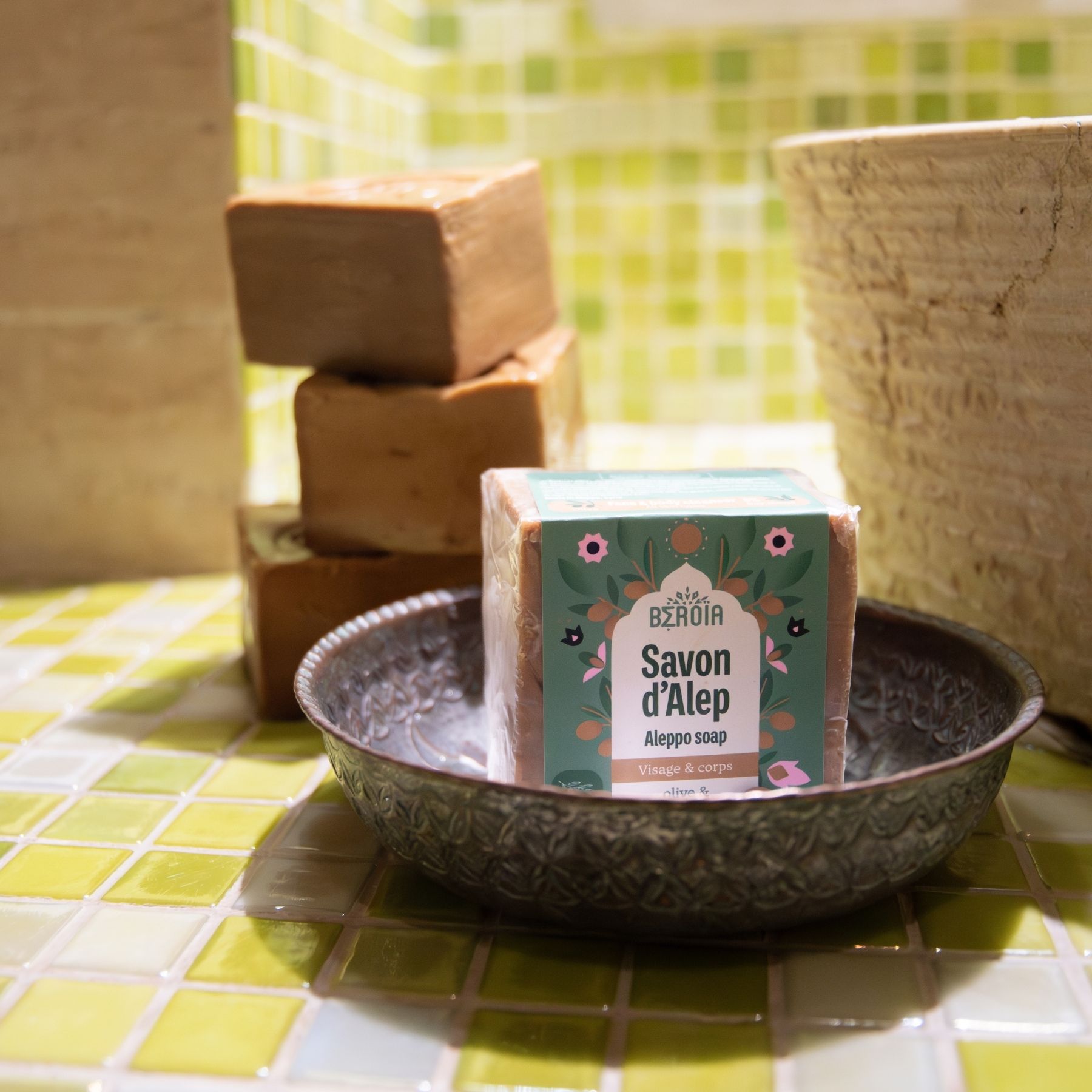 • Le savon d’Alep est élaboré depuis des siècles dans la ville d’Alep, à partir d’huile d’olive, d’eau, de soude et d’huile de baies de laurier. Beroïa s’inspire de cette tradition pour proposer un savon authentique et adapté aux usages modernes.